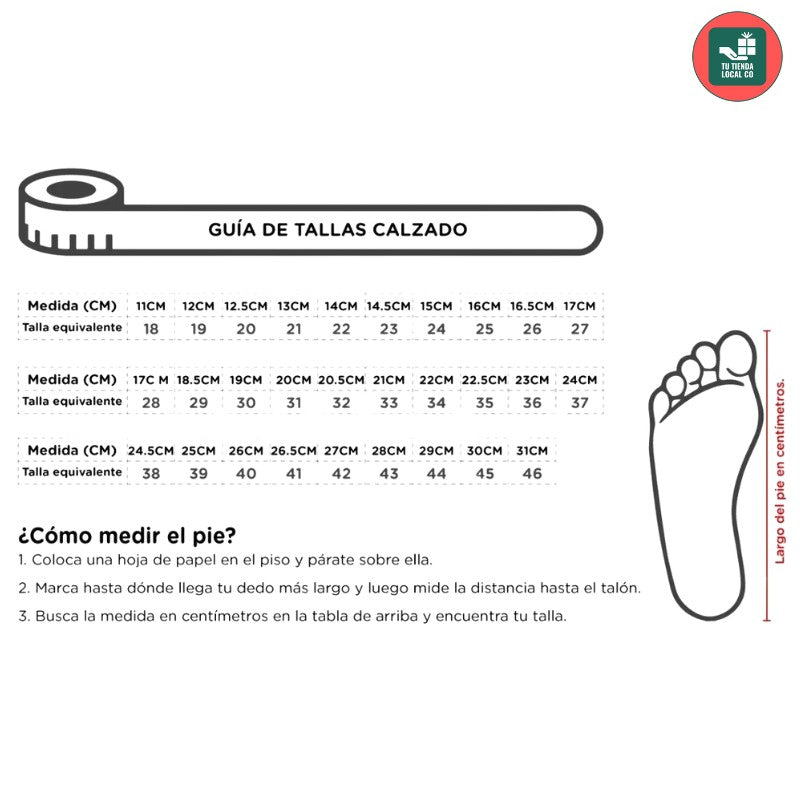 No te preocupes por la talla, es la misma que usas en Colombia, así que realiza tu pedido y disfruta de su comodidad y hermoso diseño con la medida exacta.
